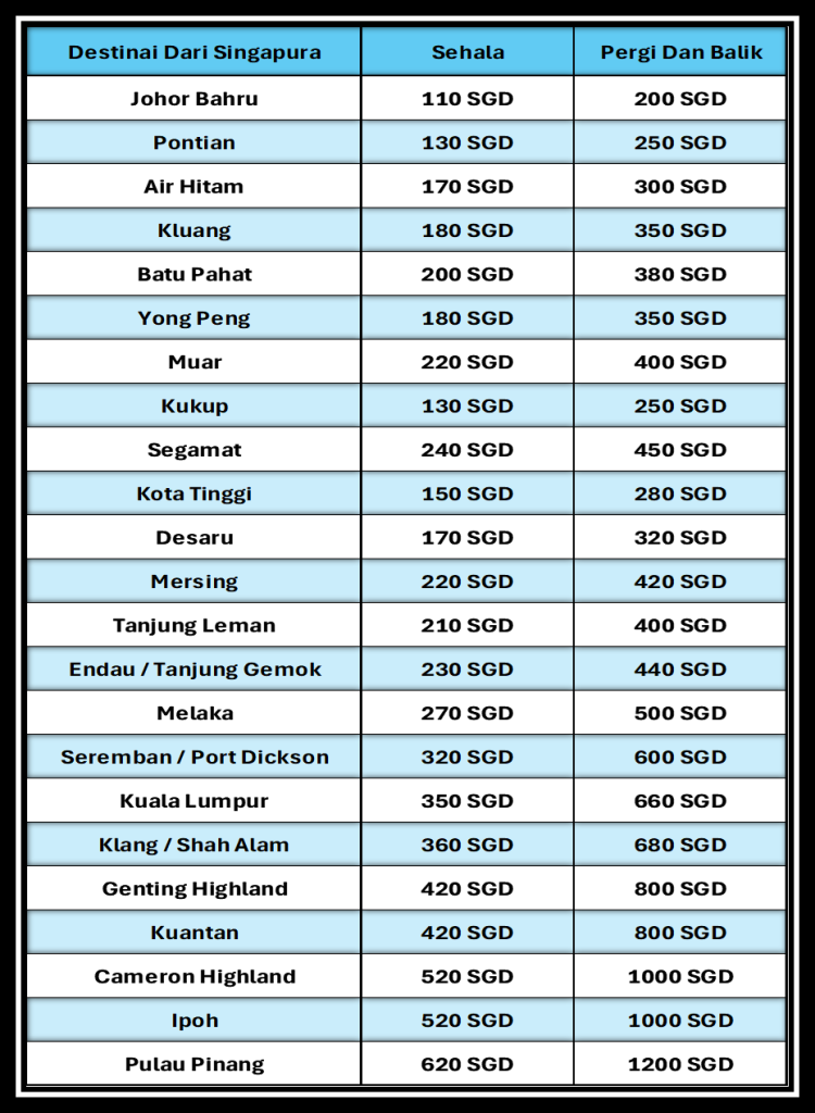 Kami Menyediakan Perkhidmatan Rentas Sempadan Untuk Johor Bahru ke Singapura dan dari Singapura ke Seluruh Malaysia . Kami juga menyediakan perkhidmatan di bawah :